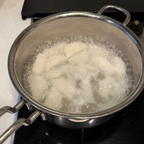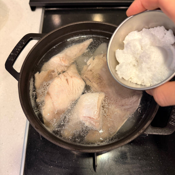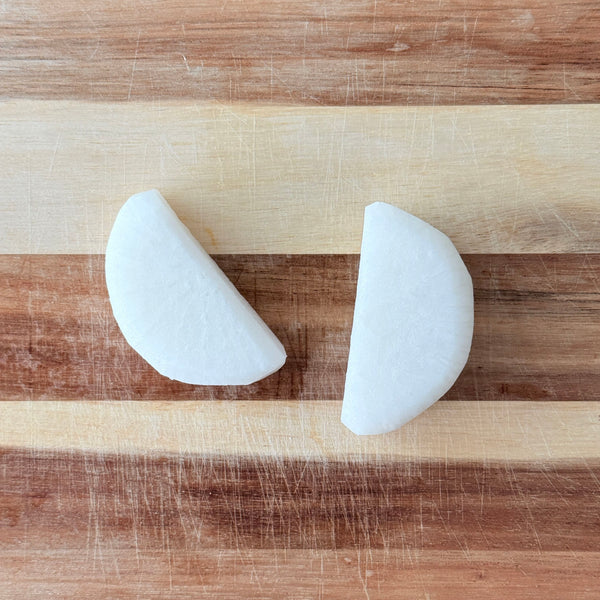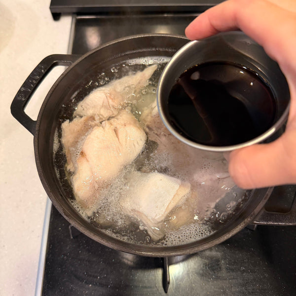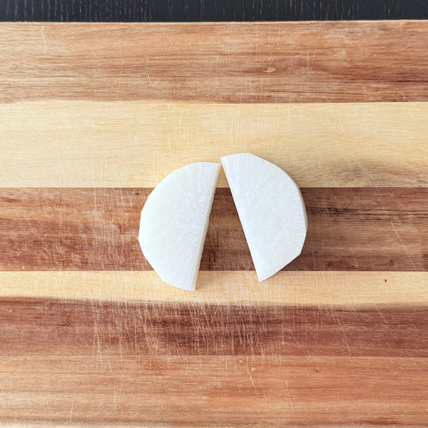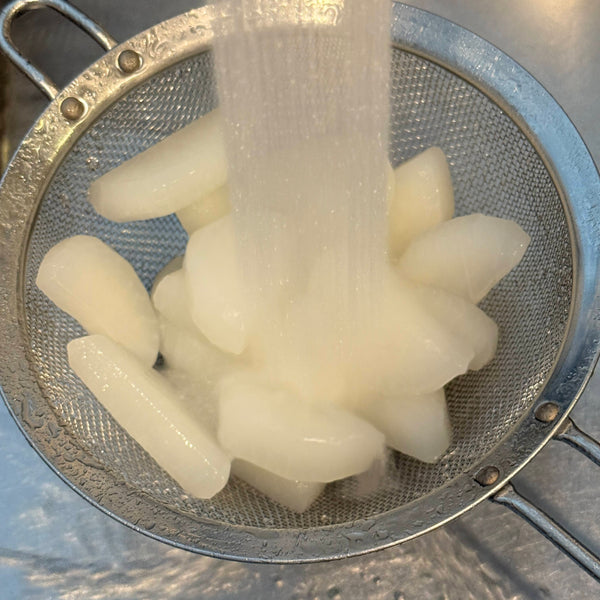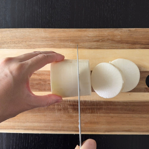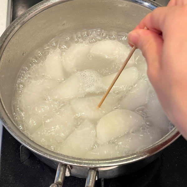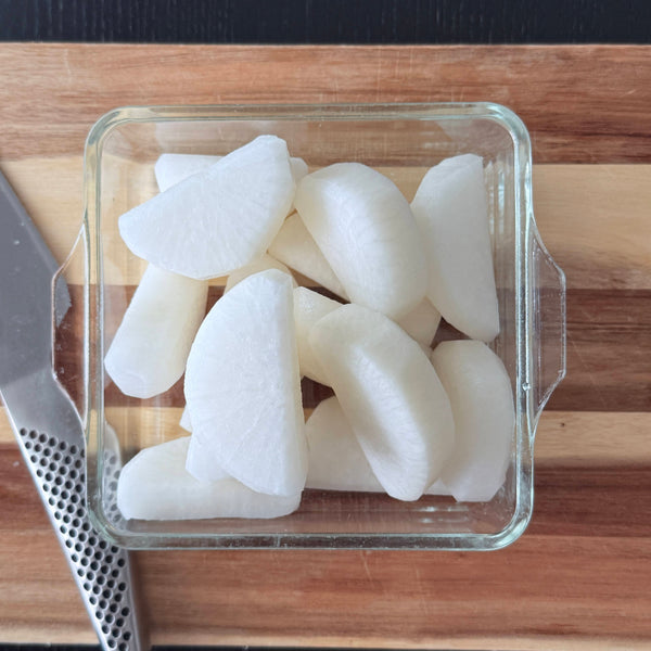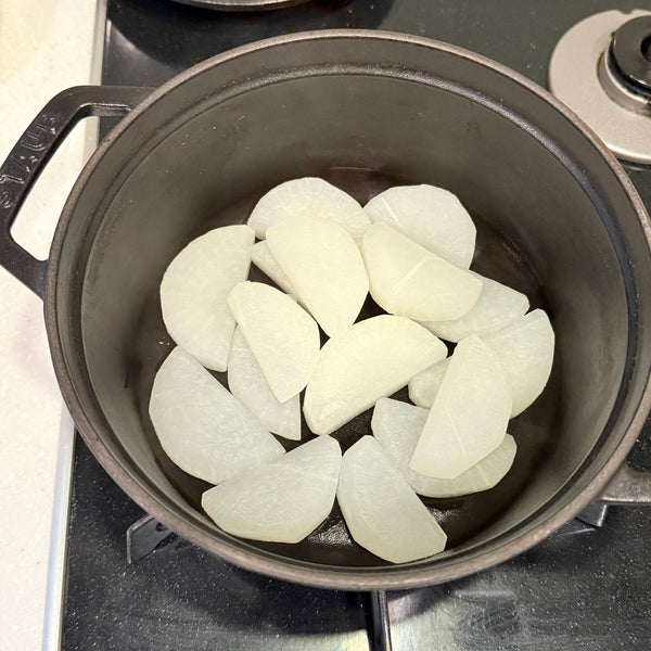또 다른 핵심 성분은 무입니다. 요리하면 무는 부드럽고 육즙이 풍부하며 믿을 수 없을 만큼 맛있습니다. 무가 국물을 완전히 흡수할 수 있도록 쌀뜨물에 미리 삶아 놓습니다. 쌀뜨물에 들어있는 전분은 무를 부드럽게 하고 자연스러운 단맛을 더해줍니다. 쌀뜨물로 두 번째 헹궈내는 것이 가장 효과적이지만, 일반 물과 생쌀 한줌을 넣고 끓여도 비슷한 결과를 얻을 수 있습니다.