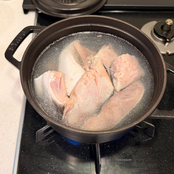 아라를 사용할 수 없으면 부리 필레도 가능합니다. 생선을 끓이는 동안 건조되는 것을 방지하기 위해 지방 함량이 더 높은 배 쪽 필레를 선택하세요. 이렇게 하면 오랫동안 요리한 후에도 최종 요리가 부드러움을 유지할 수 있습니다.