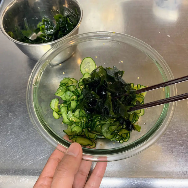 오늘은 미역을 포함한 오이 스노모노 레시피를 소개하겠습니다. 원한다면 삶은 문어 조각이나 참치 통조림 같은 다른 재료를 추가하여 샐러드의 양을 늘릴 수도 있습니다. 여러분도 저희의 간단한 레시피를 즐기고 직접 시도해 보시길 바랍니다. 이 오이 샐러드가 마음에 드셨는지 댓글로 알려주세요!