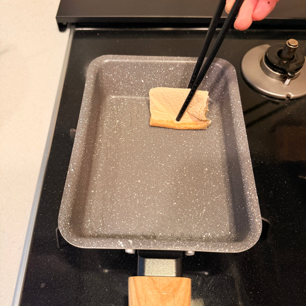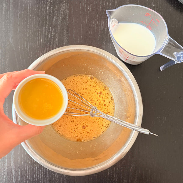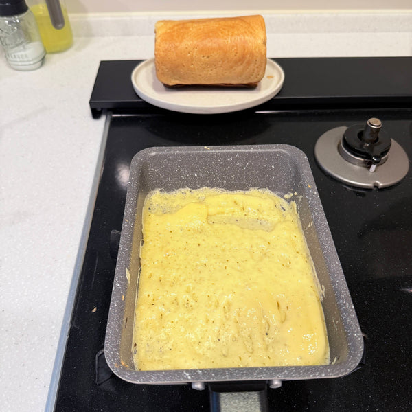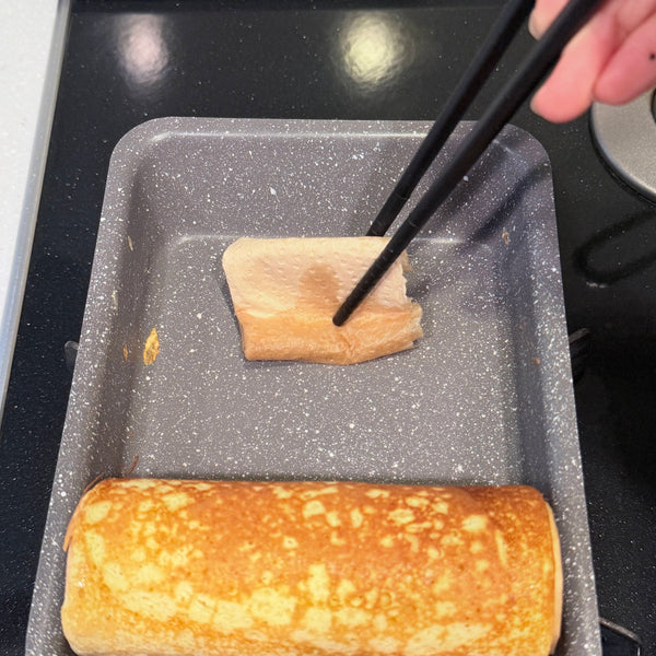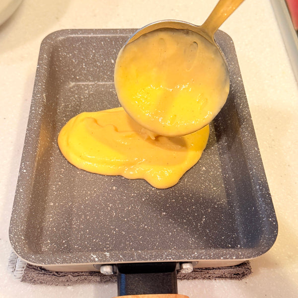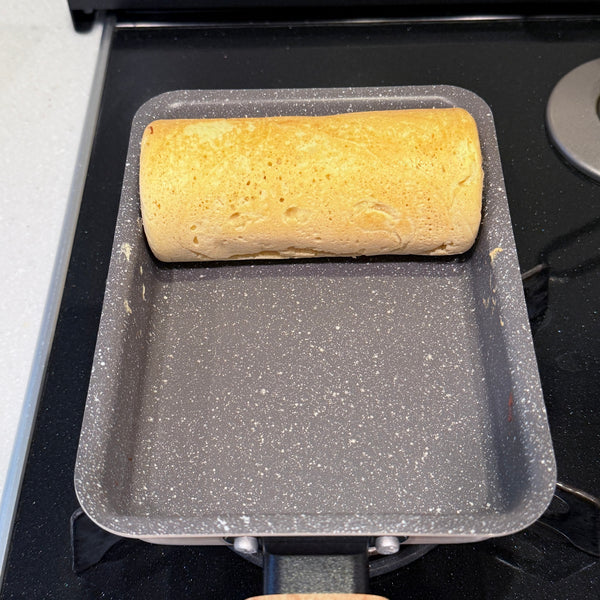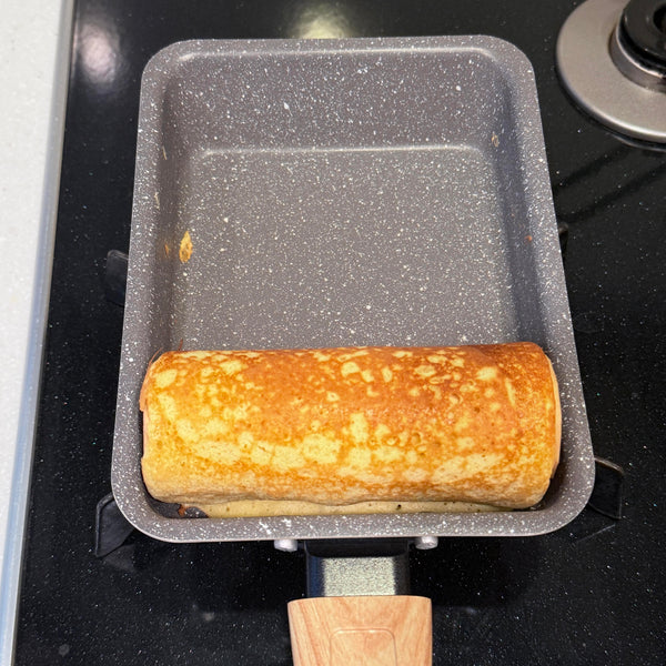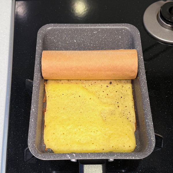 얇고 균일한 레이어를 만들기 위해 저는 일본 다마고야키 팬, 하지만 평평한 팬을 사용해도 됩니다. 핵심은 각 층을 매우 얇게 펴서 최종 케이크가 깨끗하고 아름다운 고리를 형성하는 것입니다. 레이어가 두꺼울수록 완성된 롤이 고르지 않게 보일 수 있습니다.