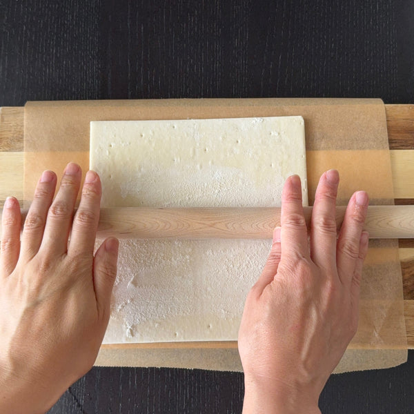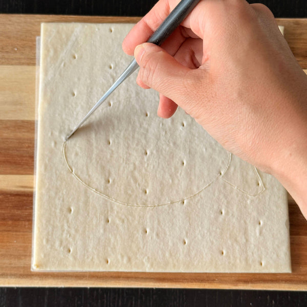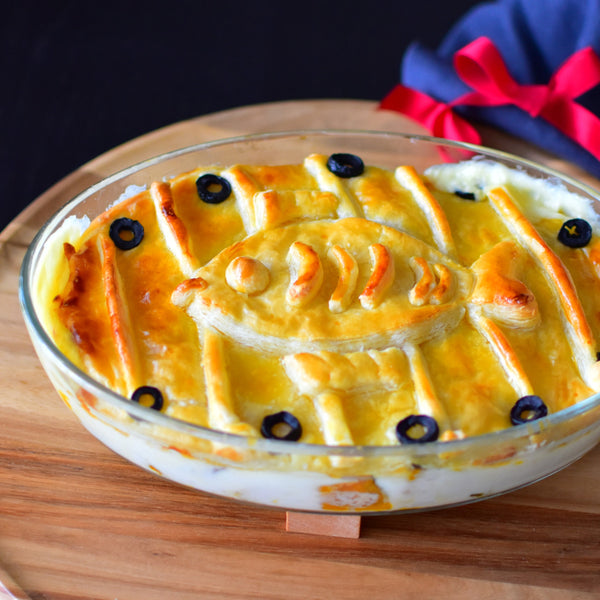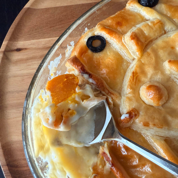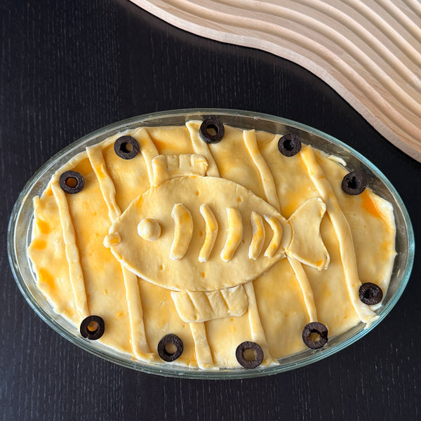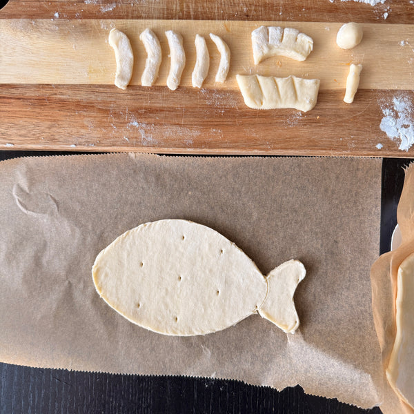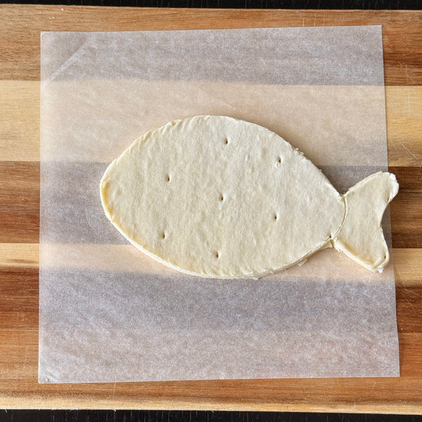 프로세스를 단순화하기 위해 몇 가지 단축키를 추가했지만 건너뛸 수 없는 한 단계는 물고기 디자인으로 파이를 장식하는 것입니다. 퍼프 페이스트리가 부드러워지기 전에 날카로운 칼을 사용하여 생선 모양을 추적하고 잘라내어 바삭하고 벗겨지는 빵 껍질을 만들었습니다. 조금 까다롭지만 확실히 재미있습니다.