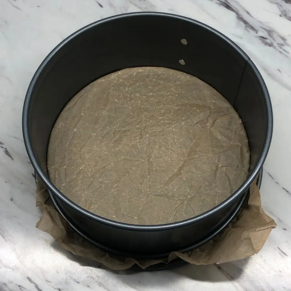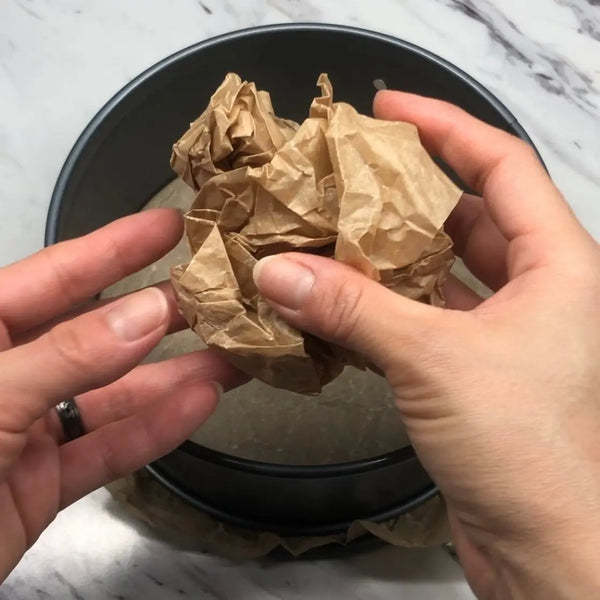 스프링폼 팬 바닥에 작은 양피지 조각을 깔아주세요. 상단에는 큰 양피지를 사용하십시오. 더 쉽게 사용하려면 유산지를 구겨서 공 모양으로 만든 후 베이킹 팬에 펴주세요.