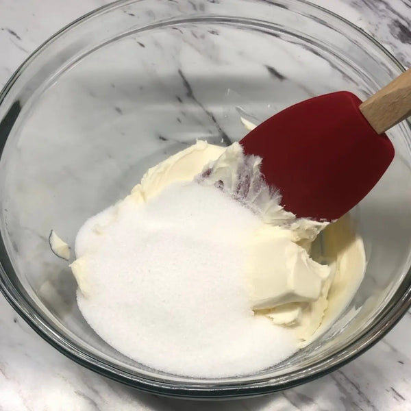 큰 그릇에 크림치즈와 설탕을 넣습니다. 덩어리가 모두 없어질 때까지 마치 으깨듯이 부드럽게 펴주세요.