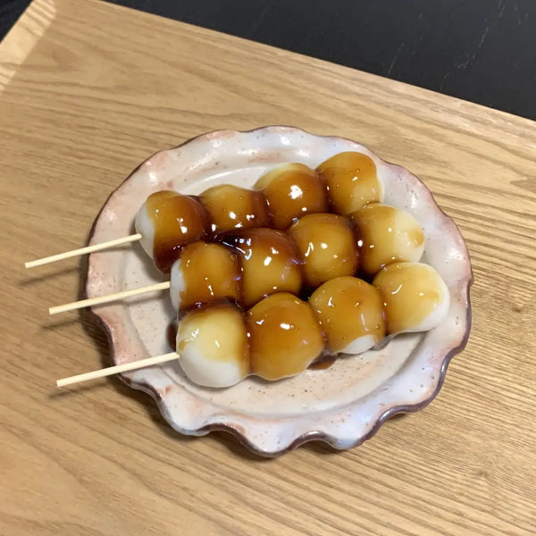 일본 과자인 미타라시 당고는 나무 막대기에 쌀만두를 꽂고 그 위에 달콤한 간장 소스를 얹은 요리입니다. '당고'는 일본어로 만두를 의미하며, 종종 따뜻한 컵과 함께 간식이나 디저트로 즐겨 먹습니다. 녹차.