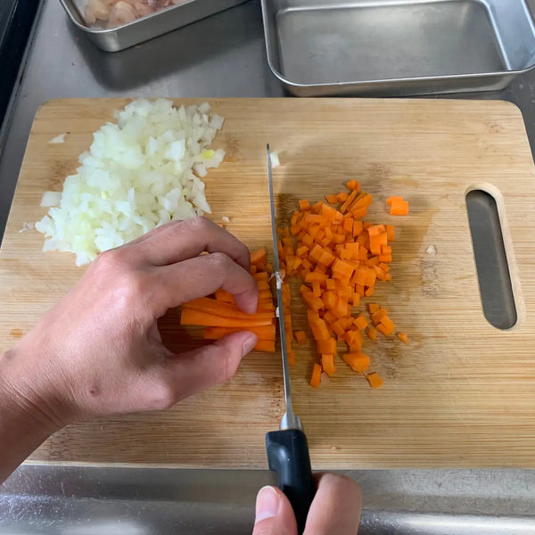 양파, 당근, 닭고기를 모두 한 입 크기로 잘게 썬다.