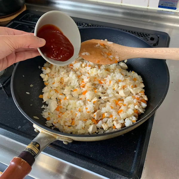 닭고기와 야채가 밥에 잘 섞이면 케첩을 넣어 볶음밥 재료를 충분히 코팅해줍니다. 소금으로 간을 맞춘 후 불을 끄고 케첩밥을 다른 그릇에 옮깁니다.