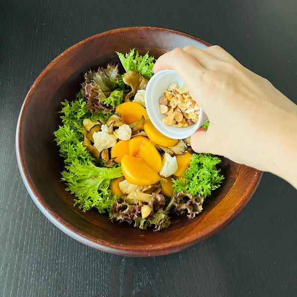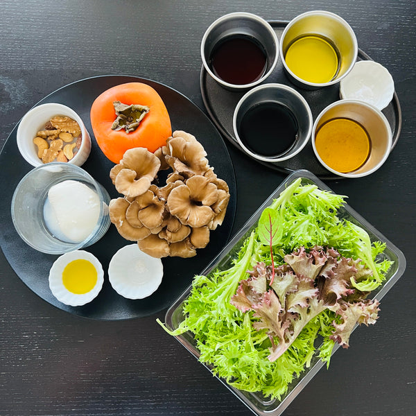 마지막으로 모임을 상상하며 샐러드를 한 그릇에 반찬으로 담아내고 있습니다. 하지만 개별 접시에 따로 담아내면 훌륭한 애피타이저가 됩니다. 토핑으로는 감과 함께 항산화 효과를 높여주는 견과류를 선택했어요.