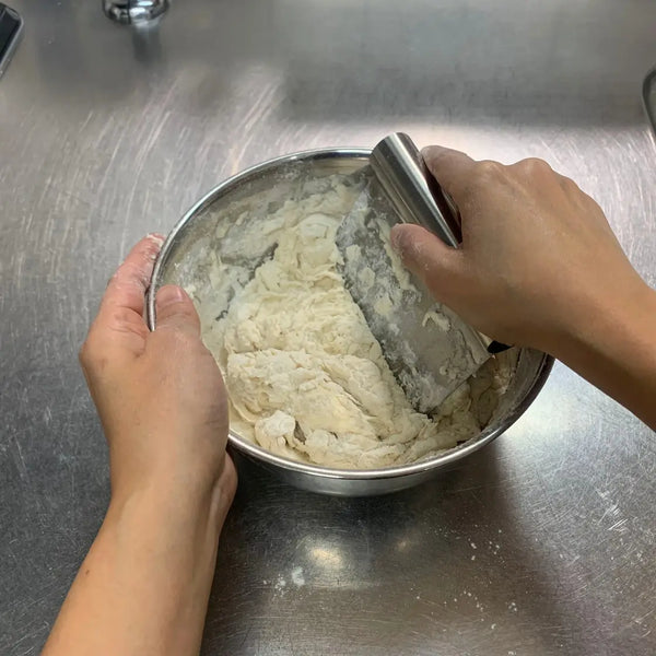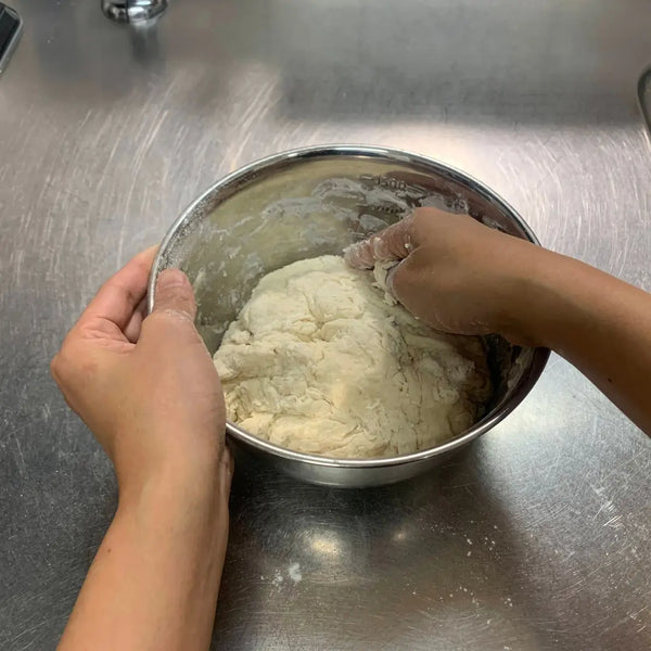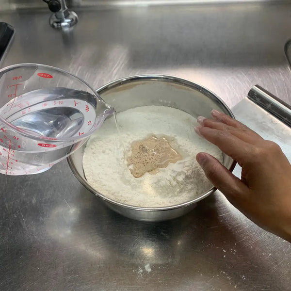 에서 그릇, 빵가루, 사탕수수 설탕, 소금, 탈지분유 등 모든 건조 재료를 섞고 벤치 스크레이퍼로 잘 섞습니다. 건조 혼합물의 중앙에 빈 우물을 만들고 물과 건조 이스트 혼합물을 붓습니다. 절단 동작을 사용하여 젖은 혼합물을 건조한 재료에 섞습니다. 혼합물이 더 이상 가루 형태가 아닌 경우 손을 사용하여 반죽을 공 모양으로 반죽합니다.