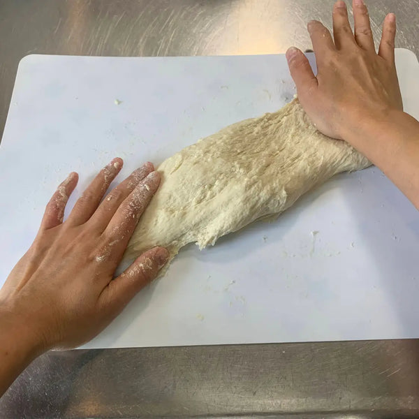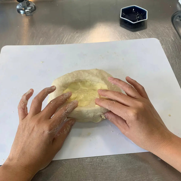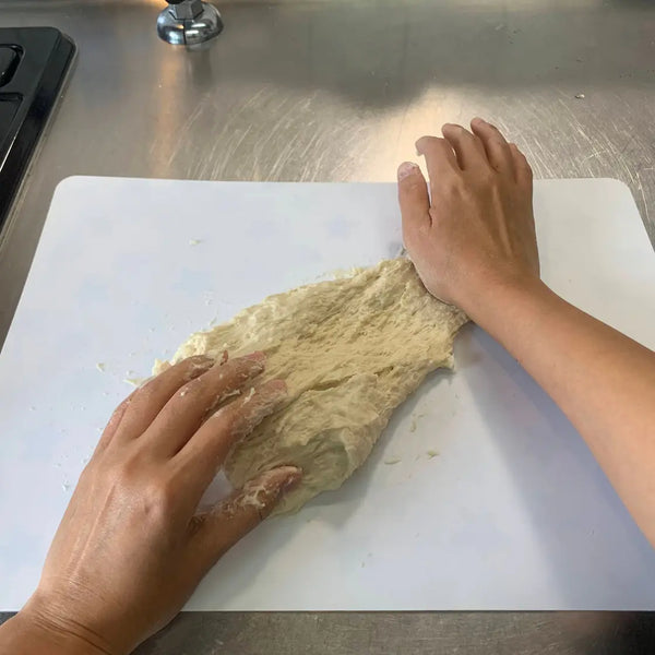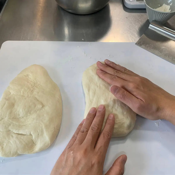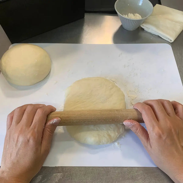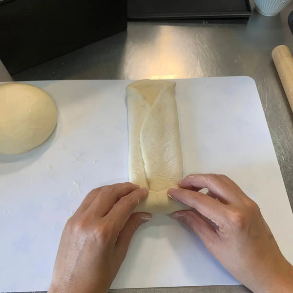 밀가루를 뿌린 도마에 반죽을 솔기가 위로 향하게 놓고 밀대를 이용해 길이 15cm, 너비 25cm 정도로 밀어주세요. 그런 다음 반죽을 90도 돌려서 약 25cm 길이로 만듭니다. 반죽을 길이 25cm, 너비 15cm 크기의 타원형으로 만듭니다.