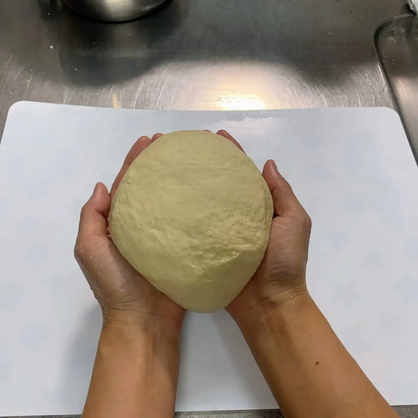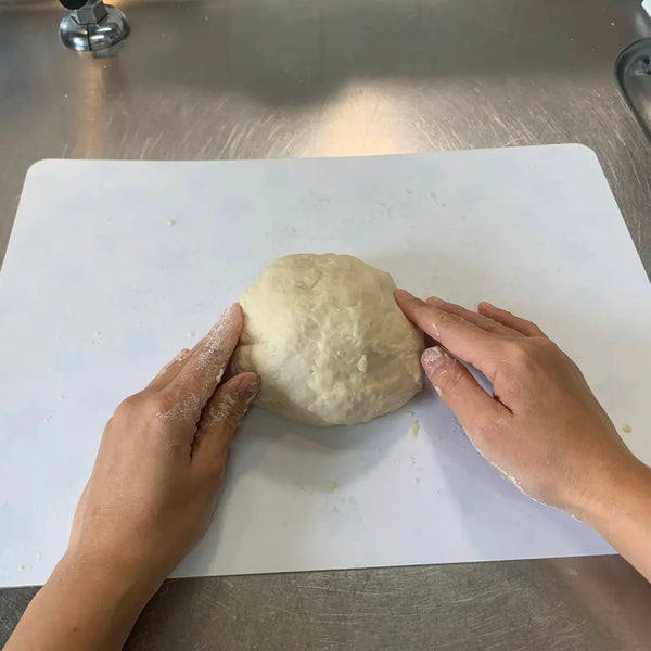 반죽의 가장자리를 아래쪽으로 모아 공 모양으로 만들어주세요. 90도 회전하고 표면이 완전히 부드러워질 때까지 이 과정을 반복합니다.