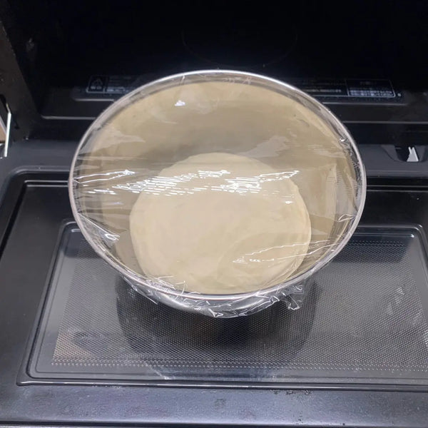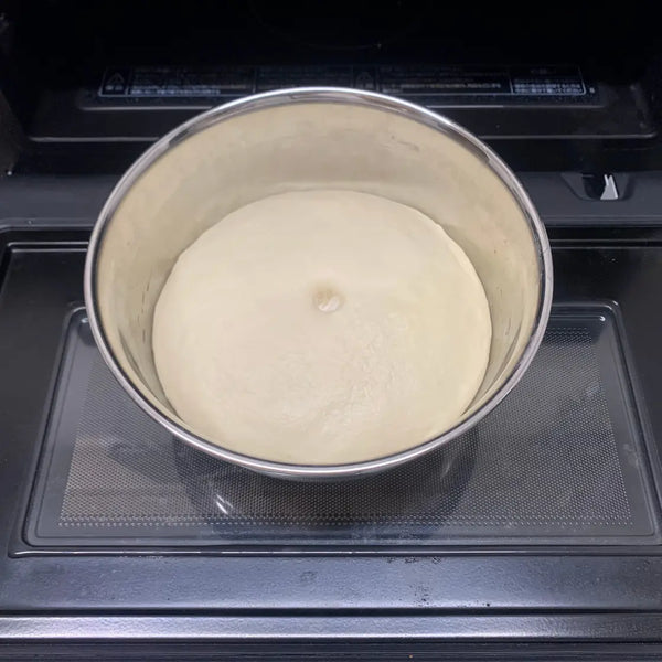 기름칠한 그릇에 반죽을 넣고 랩으로 덮어주세요 플라스틱 랩30°C(86°F)의 따뜻한 곳에 1시간 동안 놓아두세요. (예를 들어 오븐의 발효 기능을 사용할 수 있습니다.) 반죽이 두 배로 부풀면 1차 발효가 완료됩니다.