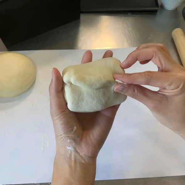 반죽이 완전히 부드러워지면 부드러워진 버터를 표면에 고르게 펴 바릅니다. 반죽을 반으로 접어 버터에 감싼 뒤, 버터를 반죽에 문지릅니다.