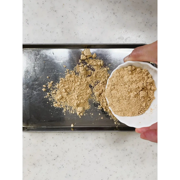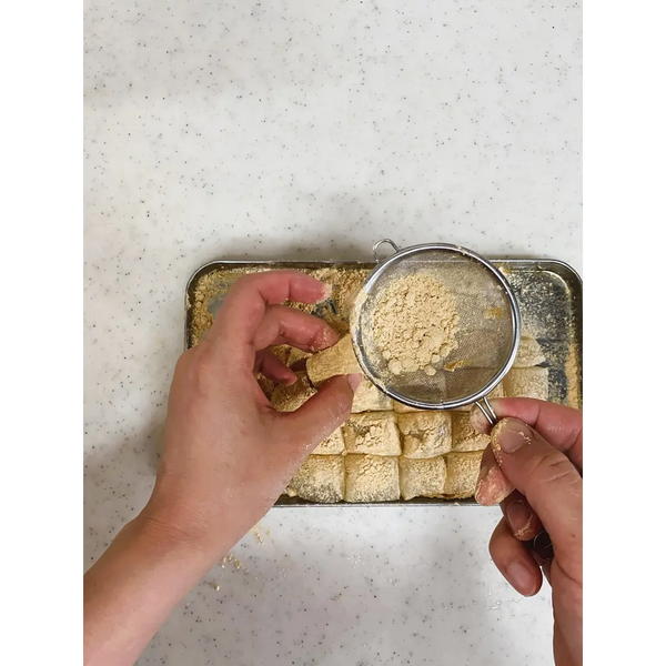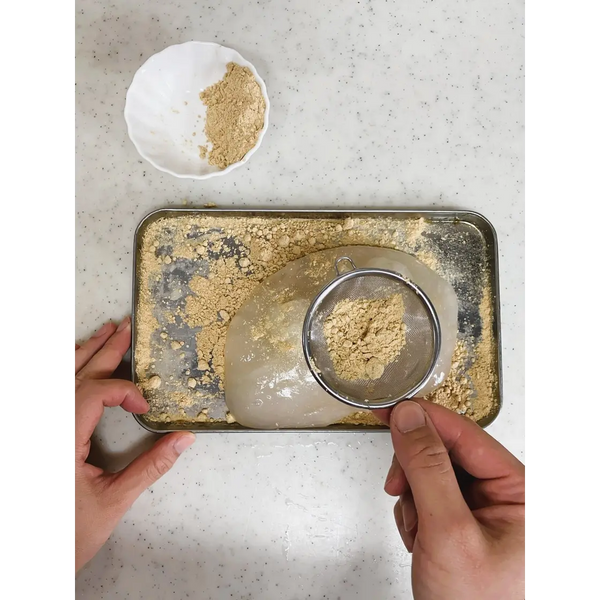 와라비모찌에 콩나물 가루를 뿌린 후 그 위에 흑미츠 설탕 시럽을 뿌려 달콤하고 상큼한 일본식 디저트를 즐겨보세요. 와라비모찌로 더운 계절을 즐겨보세요!