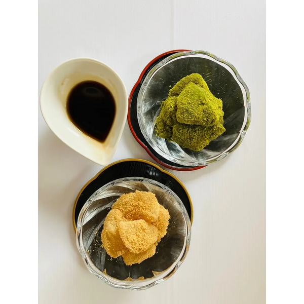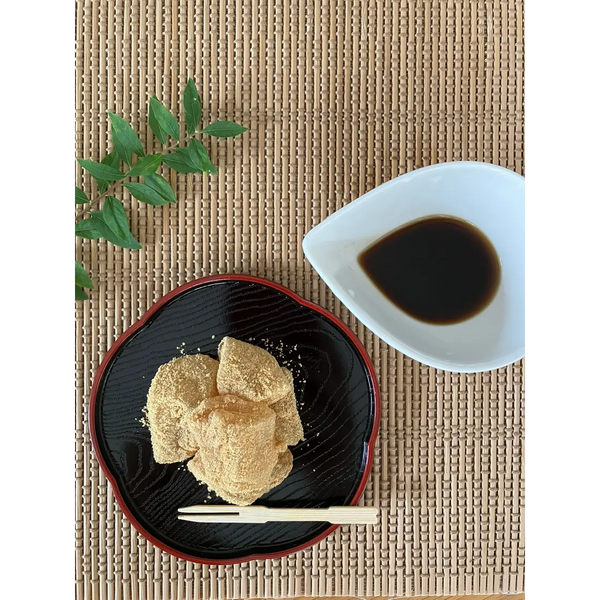 와라비모찌는 쫄깃하면서도 젤리 같은 질감을 가지고 있습니다. 키나코라고 알려진 고소한 콩 가루로 덮고 흑설탕 시럽인 쿠로미츠와 함께 제공됩니다. 일반적으로 차갑게 제공되므로 더운 여름철이나 더위를 식히고 싶을 때 즐기기에 완벽한 디저트입니다.