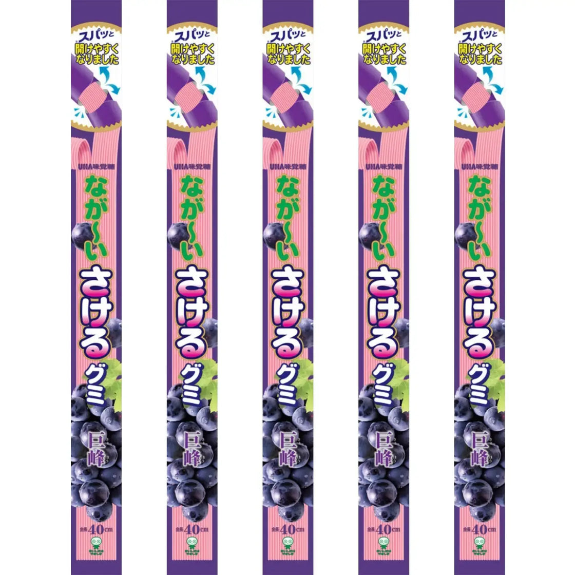 UHA Mikakuto의 40cm 길이의 포도 젤리입니다. 이 젤리는 부드러워서 계속 먹을수록 식감이 좋아집니다. 젤리는 그대로 보관해 통째로 먹어도 되고, 조각으로 잘라서 가족이나 친구들과 나눠먹어도 됩니다.